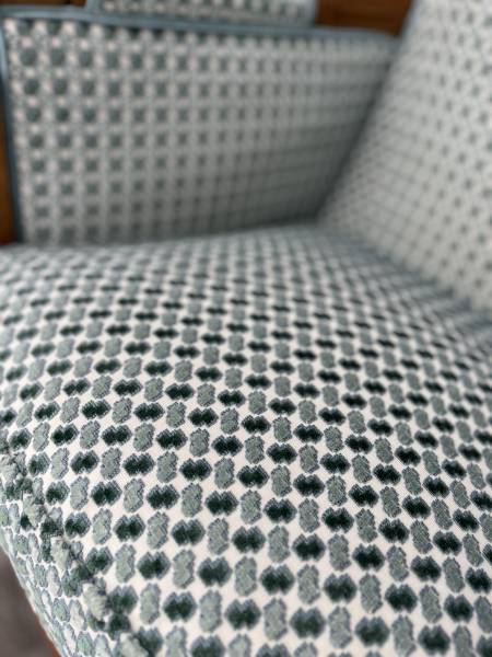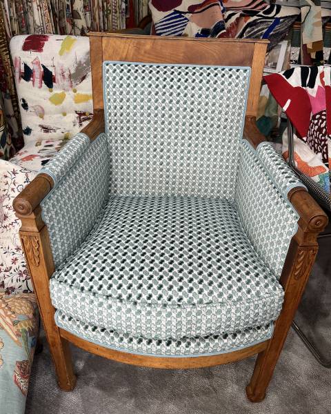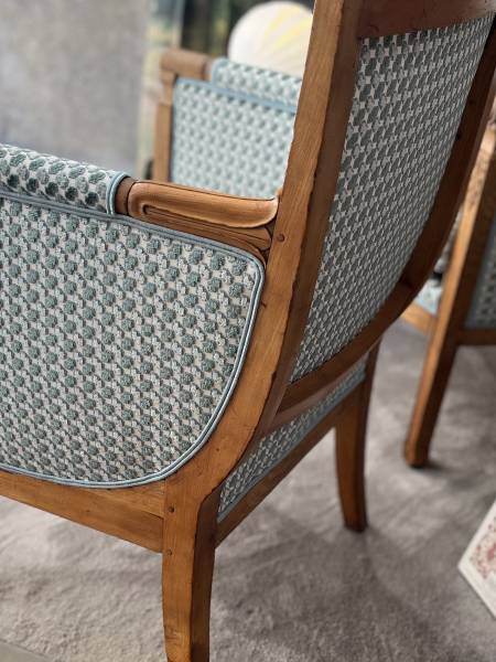 Notre atelier à Aix-en-Provence propose également des services de rénovation de mobilier. Dans ce projet, les deux fauteuils bergères avaient besoin d’une nouvelle couverture (changement de tissu) pour retrouver leur éclat, tout en s’accordant avec le reste de la pièce; longue et déjà garnie d’autres éléments décoratifs forts.