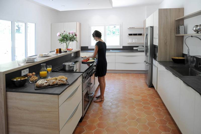 Conception et agencement d'une cuisine équipée contemporaine, de nombreux placards et d'une salle de bains.