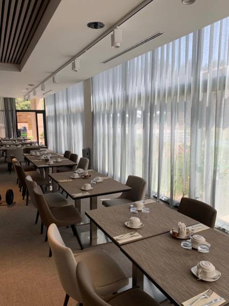 La décoration intérieure du restaurant, la Squadra Trattoria, ainsi que celle de la salle du petit déjeuner de l’hôtel ci-joint en images, privilégie la luminosité et les grands volumes. En témoigne la présence de nombreuses baies vitrées qu’il nous a été demandé d’habiller dans un esprit contemporain et épuré.