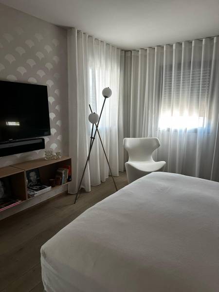 Dans ces deux installations, vous remarquerez un voilage wave sur rail apparent et un voilage wave dans une gorge, donnant cet aspect de hauteur infinie.