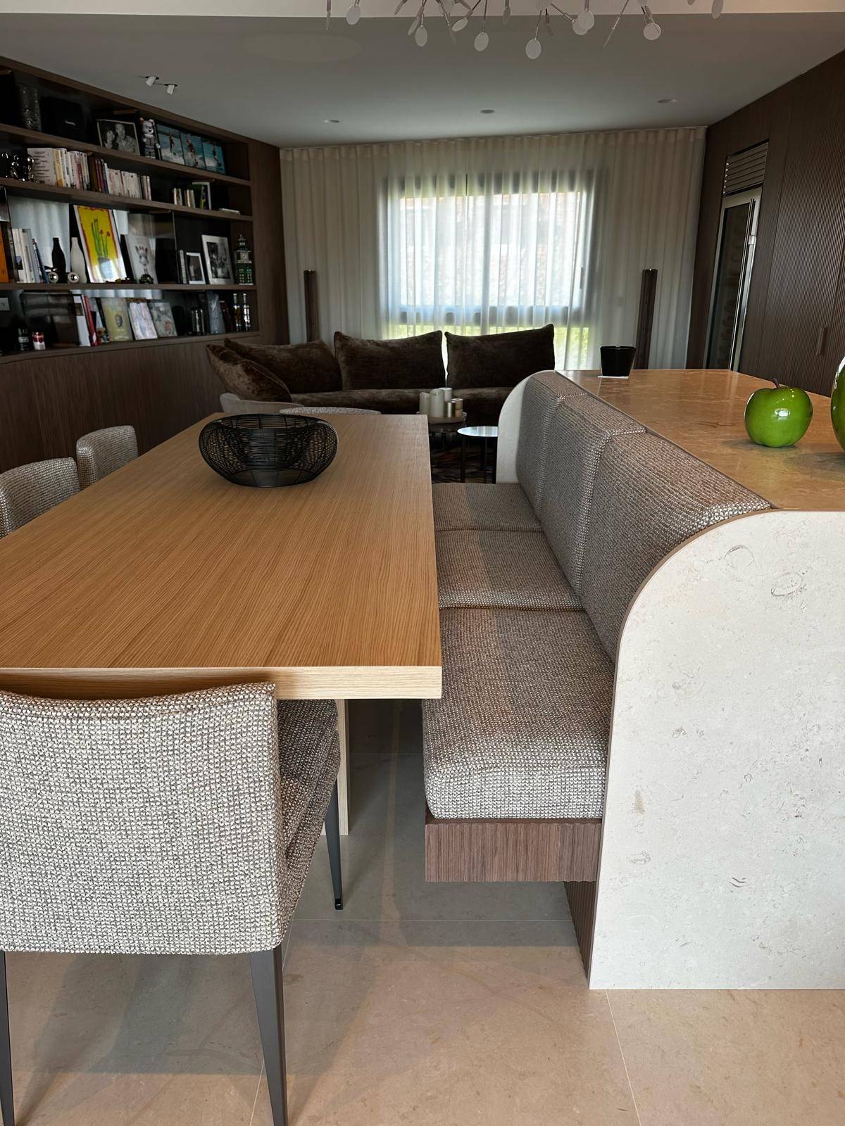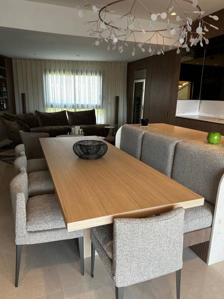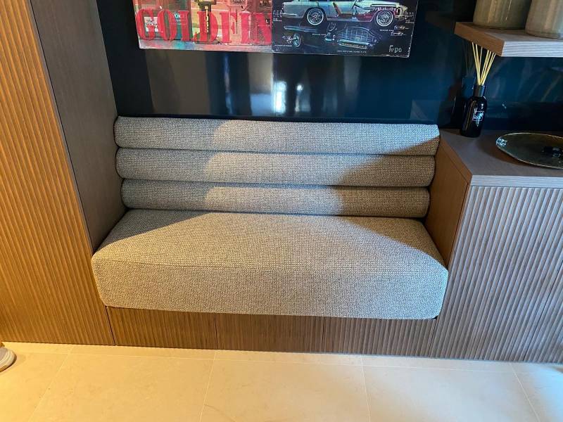 À l'Atelier du Décorateur à Aix-en-Provence, nous avons récemment achevé un projet avec trois banquettes sur mesure accompagnées de fauteuils de cuisine assortis, ainsi qu'une élégante banquette d'entrée encastrée.