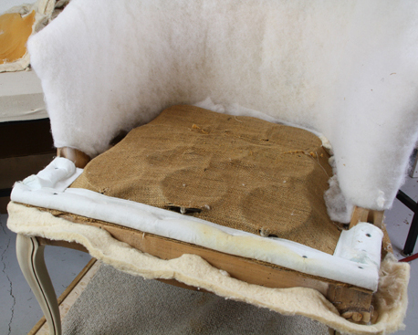 Cela consiste à recouvrir l’assise d’une toile blanche qui va couvrir la garniture et l’isoler du contact avec le tissu final. C’est la dernière étape avant la pose du tissu final. On utilise des semences de 7 que l’on appointe tous les 1,5cm. On n’appointe qu’à moitié les semences. On enfoncera les semences que lorsque la toile sera parfaitement posée et fixée. Ne pas se tromper dans le sens de la pose. C’est comme pour les autres toiles. On commence par l’arrière, au milieu. Puis un peu à l’avant au milieu. Enfin de chaque coté, au milieu. On avance progressivement en croix : un peu derrière, un peu devant, un peu à droite, un peu à gauche du siège. Et on recommence : arrière, avant, côté droit, côté gauche.