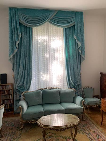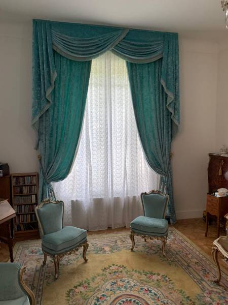 Nous avons réalisé les galons ainsi que les franges qui viennent habiller les rideaux drapés et parfaire l’esprit baroque du tissu.