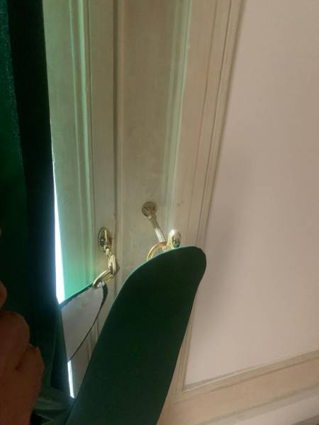 Les embrasses toilées, destinées à tenir et relever le rideau – cousues main également- sont maintenues par des pitons en laiton massif de la marque Houlès, référence française depuis plus de 95 ans, en matière de passementerie haut de gamme, de tringlerie…